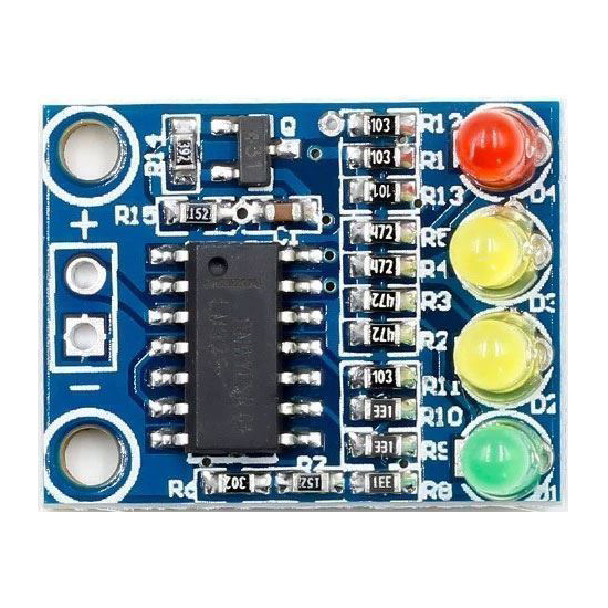Slouží ke kontrole zdrojové části automobilu, kdy pomocí 4 LED diod indikuje napětí palubní sítě v rozsahu 11-15V.Parametry produktu:- červená: Představuje 20%- žlutá (1): Představující 50%- žlutá (2): Představující80%- zelená: představuje 100%Technické parametry: - chipset: LM339- minimální provozní teplota: -40 ° C- maximální provozní teplota: 85 ° C- montáž: 2 otvory 2,4 mm- rozměry 22×17mmVýrobek není samostatně funkční celek, vyžaduje odbornou montáž.