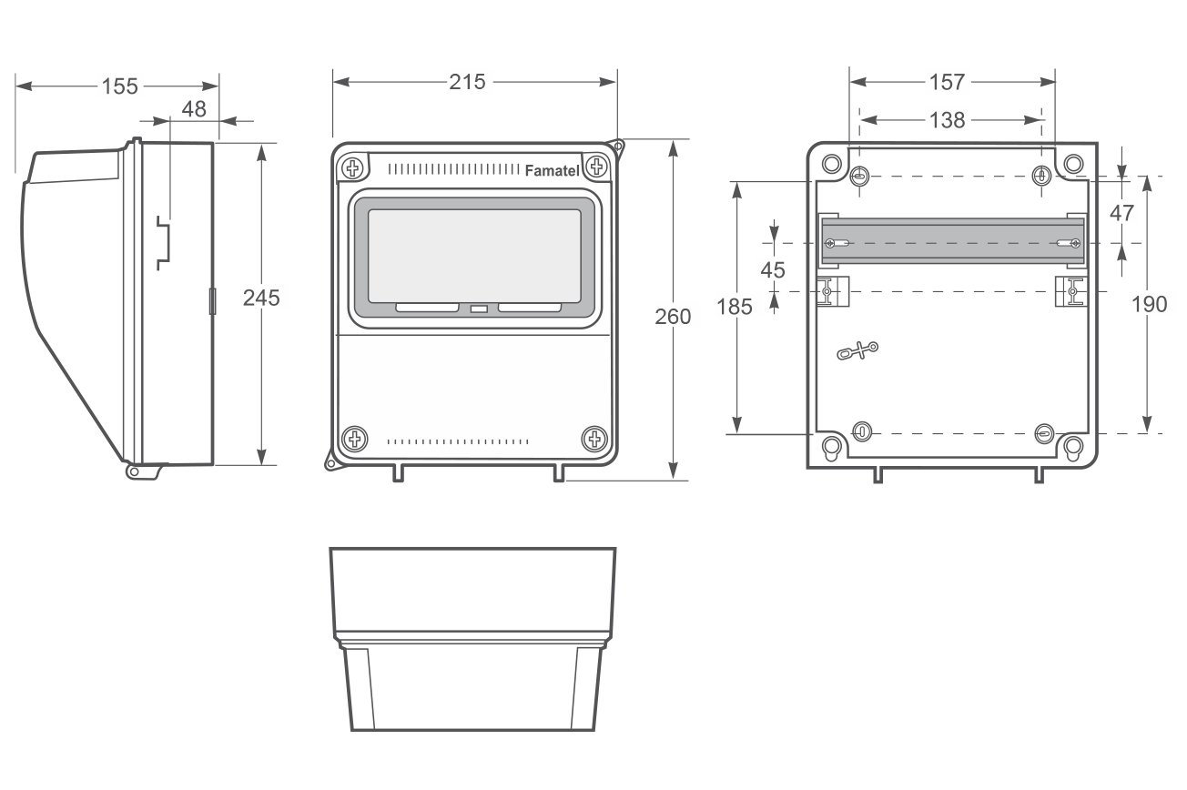 Zásuvková skříň (rozváděč nízkého napětí) FAMATEL v105-ZSF20000000.V /3957 IP54/pouze vydrátovaná, zásuvky 2x230V/16A (s ochranným kolíkem dle ČSN), použité pouzdro: 3957 - celkem k dispozici 9mod. míst, rozměry: 245x215x155mm, plastová, materiál ABS, IK08, zkouška žhavou smyčkou 650°C, bezhalogenová a UV odolná, montáž na povrch, barva: světle šedá, rozsah teplot -25°C + 85°C, aplikované normy: IEC 61439-3 (Rozváděče nízkého napětí - Část 3: Rozvodnice určené k provozování laiky (DBO), balení: 1ks (fólie), zásuvky na 230V/16A s ochranným kolíkem dle ČSN, polykarbonátové okénko, jistící prvky EATON, PE svorkovnice součástí (6x16mm2), N svorkovnice součástí (6x16mm2), hladké stěny (bez prolisů) pro vyvrtání vstupního otvoru a následné osazení příslušnou vývodkou (pro CYKY 5x6; 4x10; 5x10 => M25; pro CYKY 5x16 => M32), max. připojitelný vstupní kabel = 4x25 nebo 5x16 (Cu). Pro montáž na hořlavé podklady je nutné použít nehořlavou podložku.