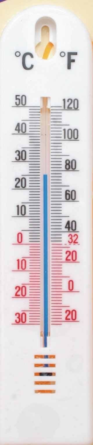 - Dvojí stupnice: Celsius (levá) a Fahrenheit (pravá)