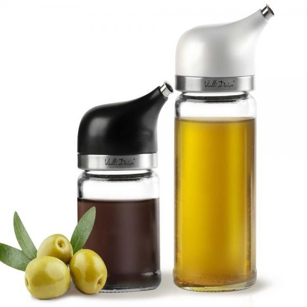 Elegantní a praktická sada dávkovačů od Vialli Design. Sada je určena především na olivový olej a vinný nebo balzamikový ocet. Skvěle se hodí i na sójové omáčky nebo jiné tekuté dochucovače. Vysoce kvalitní zpracování, snadné použití a atraktivní vzhled jsou přednosti tohoto produktu. Díky mimořádně praktickým dávkovačům s neodkapávacím systémem snadno pokryjeme povrch pánve tenkou vrstvou oleje, salát, či jiná jídla přesně okořeníme. Elegantní forma Vám umožní používat je v kuchyni i u stolu. Skleněný dávkovač s průhlednými stěnami Vám umožní vidět obsah a zároveň kontrolovat jeho hladinu. Černobílé barvy se budou skvěle hodit do modernistických kuchyní a výrobek bude i zajímavým dekorativním prvkem.