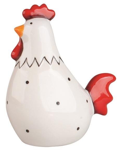Vyrobený z kvalitní keramiky, nabízí tento kohout jedinečný design a pevnou konstrukci, díky čemuž je ideální pro postavení na poličku, stůl či komodu. Jeho rozměry 11 x 6 x 13 cm jsou vhodné pro různé typy prostor, ať už chcete ozvláštnit kuchyni, obývací pokoj nebo pracovnu. Červené detaily dodávají výrobku živost a atraktivitu, které dokonale doladí váš interiér.