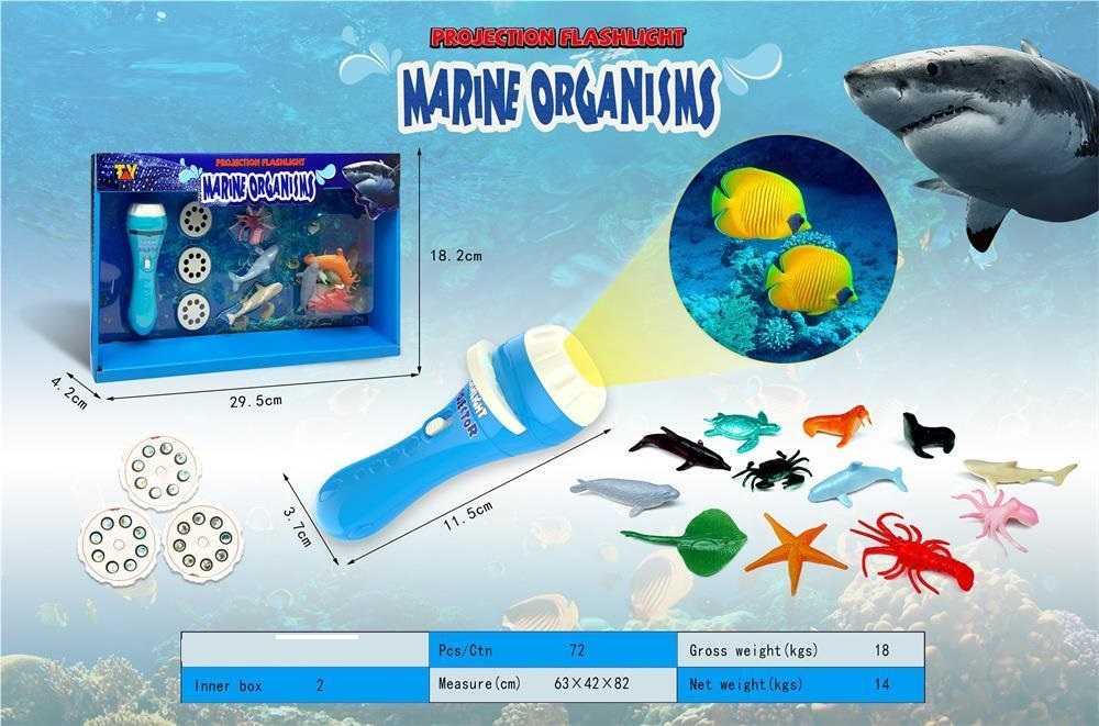 Projektor 24 snímků se zvířátky - Moře. Obsahuje projektor, 3 kotouče se snímky (celkem 24 snímků), 12 figurek mořských živočichů. Délka projektoru 11,5 cm, velikost zvířátek 5 - 6 cm. 3xAG13 baterie do projektoru součástí. Přepínač ON/OFF na projektoru. Zaostřovací prstenec na projektoru. číst celé