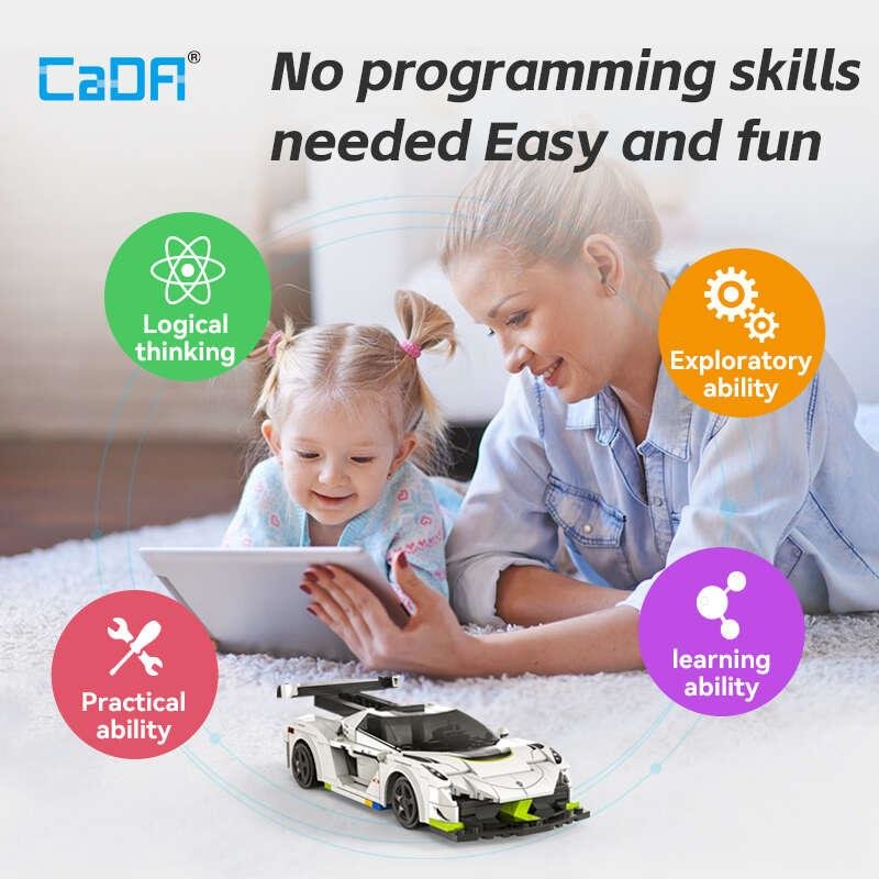 Klocki CADA. SSamochód zdalnie sterowany Auto wyścigowe białe 22 cm Fantasma Race Car Pojazd 322 el. Marka CaDA słynie z wysokiej jakości klocków konstrukcyjnych, które pozwalają na tworzenie różnorodnych zestawów, w tym zdalnie sterowanych pojazdów. Seria Make Your Bricks Move została stworzona z myślą o fanach klocków konstrukcyjnych, którzy poszukują wyzwań i chcą rozwijać swoje umiejętności manualne. Wyścigowe auto Fantasma Race Car Zestaw składa się z 322 elementów, które umożliwiają samodzielne złożenie zdalnie sterowanego auta wyścigowego w skali 1:20. Fantasma Race Car został stworzony ze szczególną dbałością o detale, co gwarantuje niesamowitą zabawę. Wyposażony w 4 gumowe koła, pozwala na swobodne poruszanie się po różnych powierzchniach. Biała karoseria z czarnymi i zielonymi elementami nadaje pojazdowi wyjątkowy wygląd. Funkcje: Dual Mode: sterowanie za pomocą pilota lub aplikacji Bluetooth, Możliwość jazdy do przodu, do tyłu, w prawo i w lewo. Zawartość zestawu: 322 elementy, w tym klocki i akcesoria, Pilot 2.4 GHz zasilany bateriami typu AAA (2 x 1,5V - brak baterii w zestawie), Instrukcja. Sterowanie RC Dual Mode Pojazdem można sterować za pomocą dołączonego pilota 2,4 GHz lub aplikacji Bluetooth, umożliwiając zdalne sterowanie na odległość ponad 25 metrów bez utraty połączenia. Pilot zapewnia kontrolę nad ruchem pojazdu, a aplikacja dostępna na systemy Android i IOS oferuje różne tryby sterowania, w tym kontrolę za pomocą ruchu telefonu. Specyfikacje: Zdalnie sterowany model, Ilość elementów: 322, Maksymalna prędkość: 5,7 km/h, Zasięg zdalnego sterowania: ponad 25 m, Wymiary pojazdu po złożeniu: 21,6 x 8 x 5,8 cm, Elementy kompatybilne z innymi zestawami CaDA oraz klockami innych producentów. Informacje techniczne: Zestaw przeznaczony dla dzieci od 6 roku życia, Sterowanie radiowe (2,4 GHz) lub przez aplikację Bluetooth, Wymagane baterie do pilota: 2 x AAA (brak w zestawie), Wymagane baterie do pojazdu: 3 x AA (brak w zestawie), Model: Fantasma Race Car, Wymiary opakowania: 30 x 21 x 6 cm, Kod producenta: C51083W.