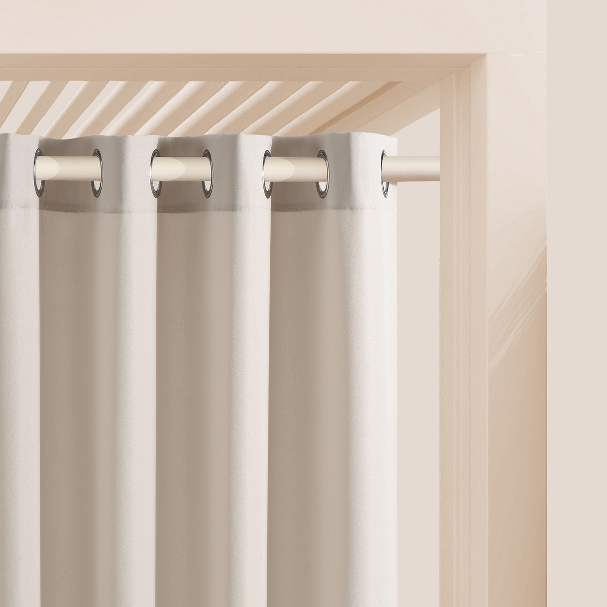Kvalitní široký dekorační závěs v moderních barvách ideální pro terasu, zahradní altán nabo balkón s kroužky pro tyčovou gárnyž. Závěs není zatemňovací, má částečnou světelnou propustnost. Vysoce kvalitní, odolná polyesterová tkanina s hustou vazbou. Tkanina je odolná proti oděru, poškrábání a jiným mechanickým poškozením. Látka závěsu není voděodolná. Je krásnou dekorací a ideální ochranou před větrem a slunečními paprsky.