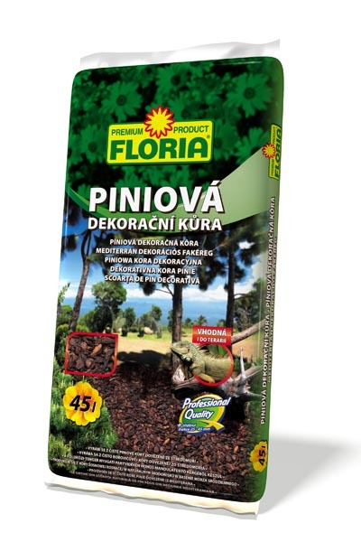 FLORIA Dekorační piniová kůra je vysoce dekorativní materiál určený pro pokrytí půdy na záhonech a v květináčích. Použití je vhodné pod keříky, stromy a také svahovité plochy. Můžeme ji použít jako ozdobu terárií. Krom svých okrasných vlastnostní také zabraňuje vysychání a rozbahnění půdy. Díky optimální struktuře kůry si Vaše zahrada zachová dlouhodobě požadovaný vzhled. Neobsahuje další příměsi.