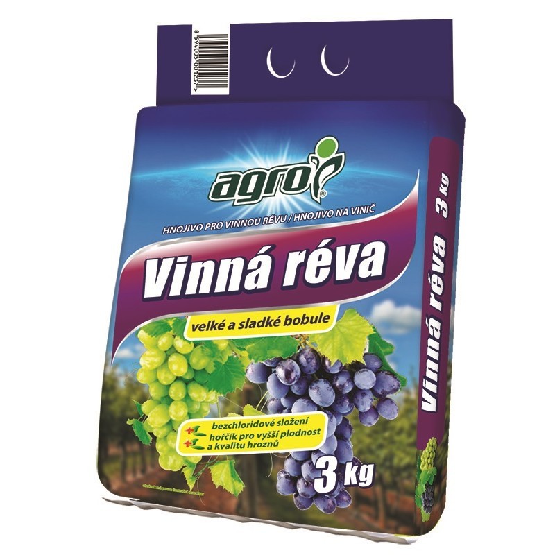 Agro HNOJIVO PRO VINNOU RÉVU díky optimálnímu poměru živin splňuje požadavky pro zdravý vývoj a silný růst révy, bohatou plodnost a vysokou kvalitu hroznů. Je to hnojivo s nízkým obsahem chlóru. Lze ho použít i ke hnojení všech ostatních rostlin. Vyšší obsah hořčíku zajišťuje zdravé zelené listy. Správným používáním tohoto hnojiva se můžete těšit z krásných, zdravých a chutných plodů.