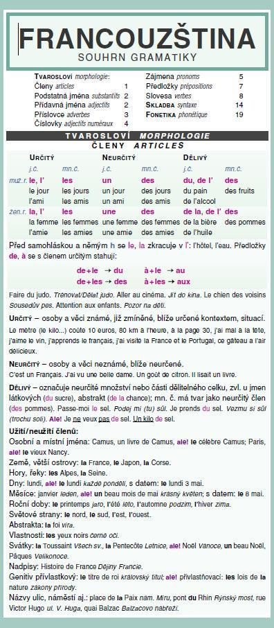 - Obsahuje hlavní gramatické jevy francouzského jazyka (tvarosloví, skladba).
