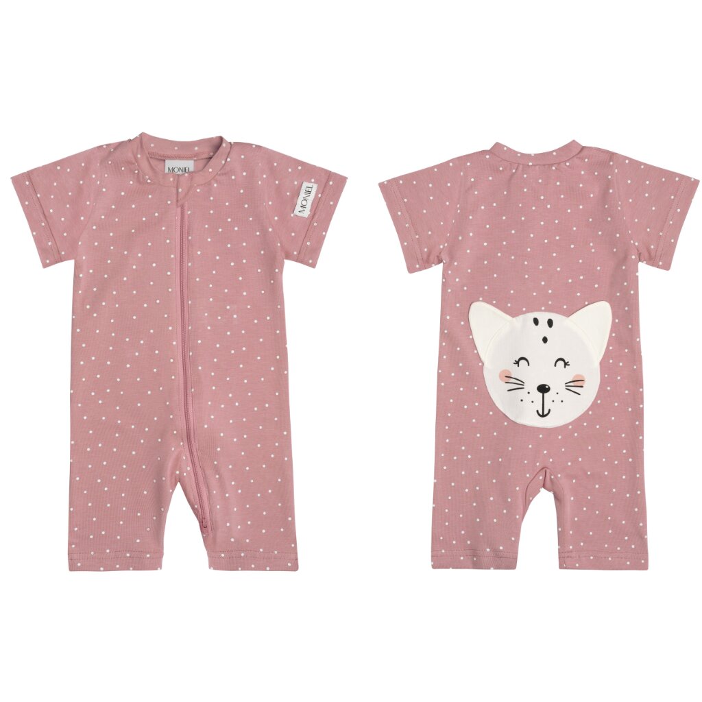 Dětský letní overal na zip s krátkým rukávem Moniel Kočka Dots růžová je ideální jarní a letní oblečení pro děti. Nosit se dá jako dětské lehké pyžamo, domácí oblečení, ale i pohodlné letní oblečení na ven. Je ušitý z přírodní bavlněné látky hebké na dotek a odolné proti častému praní. Overal je ušitý v ČR. Velikosti od narození až do 4 let.