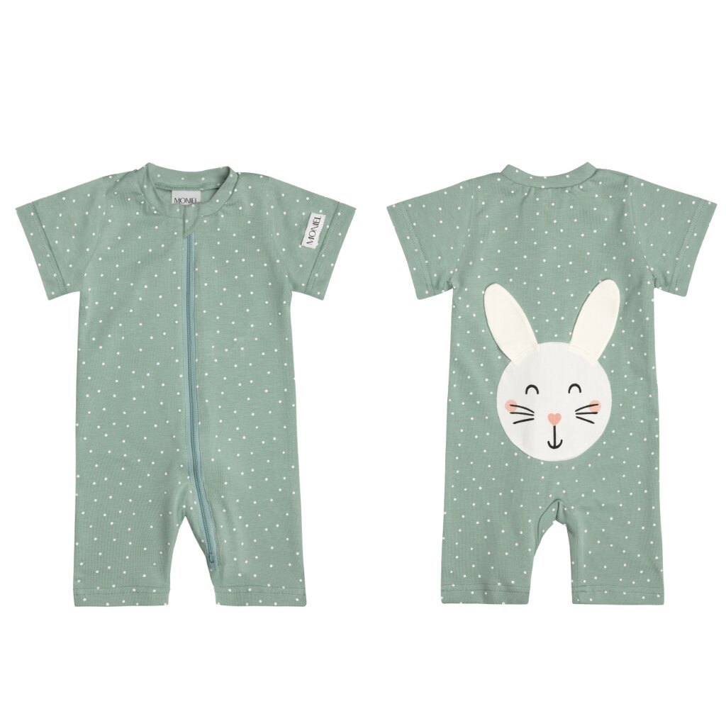Dětský letní overal na zip s krátkým rukávem Moniel Králík Dots mintová je ideální jarní a letní oblečení pro děti. Nosit se dá jako dětské lehké pyžamo, domácí oblečení, ale i pohodlné letní oblečení na ven. Je ušitý z přírodní bavlněné látky hebké na dotek a odolné proti častému praní. Overal je ušitý v ČR. Velikosti od narození až do 4 let.