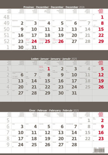 Kalendář nástěnný 2025 - Tříměsíční šedý vám pomůže snadno a rychle plánovat vaše aktivity díky přehlednému zobrazení tří měsíců najednou. Už nikdy nezapomenete na důležité termíny a události.