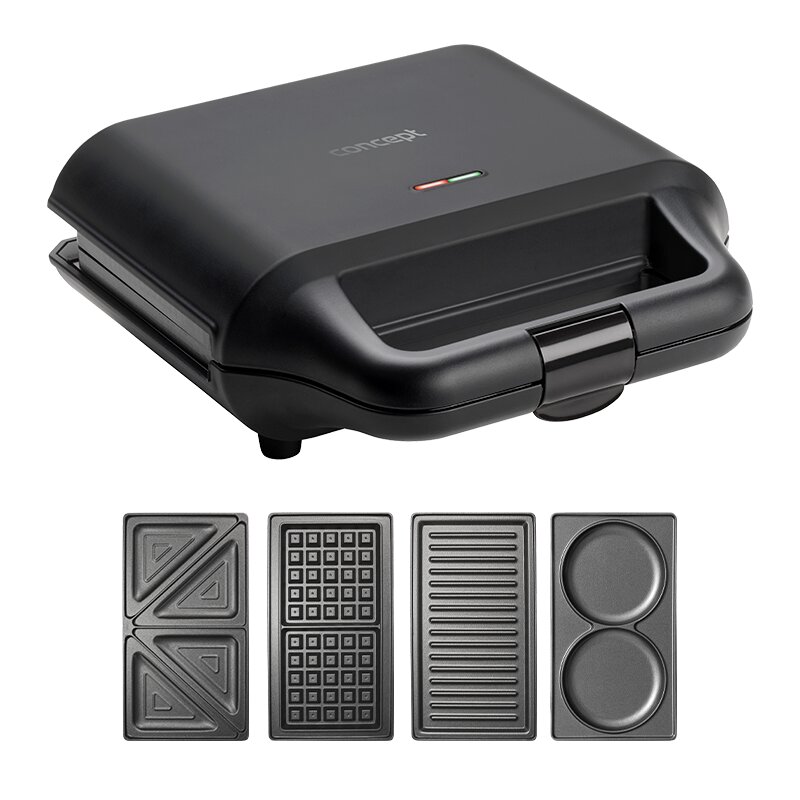 Toustovač 4v1 Concept SV3055 v elegantním černém designu vám pomůže s rychlou přípravou snídaně, obědu, svačiny i večeře. Díky čtyřem vyměnitelným deskám nabízí široké využití. Stačí si jen vybrat, na co máte zrovna chuť. V jednom těle získáte hned čtyři praktické pomocníky, kteří vám v kuchyni zaberou minimum místa.