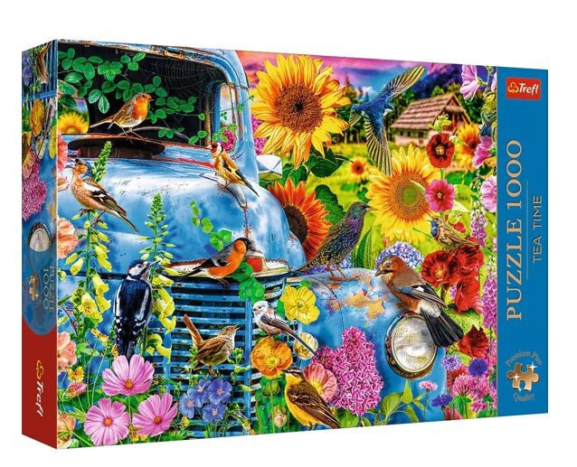 Puzzle Wiejska sielanka: Śpiewające Ptaki przedstawiają stare auto w otoczeniu ptaków oraz kwiatów. Po ich ułożeniu powstanie obraz o wymiarach 683x480 mm.