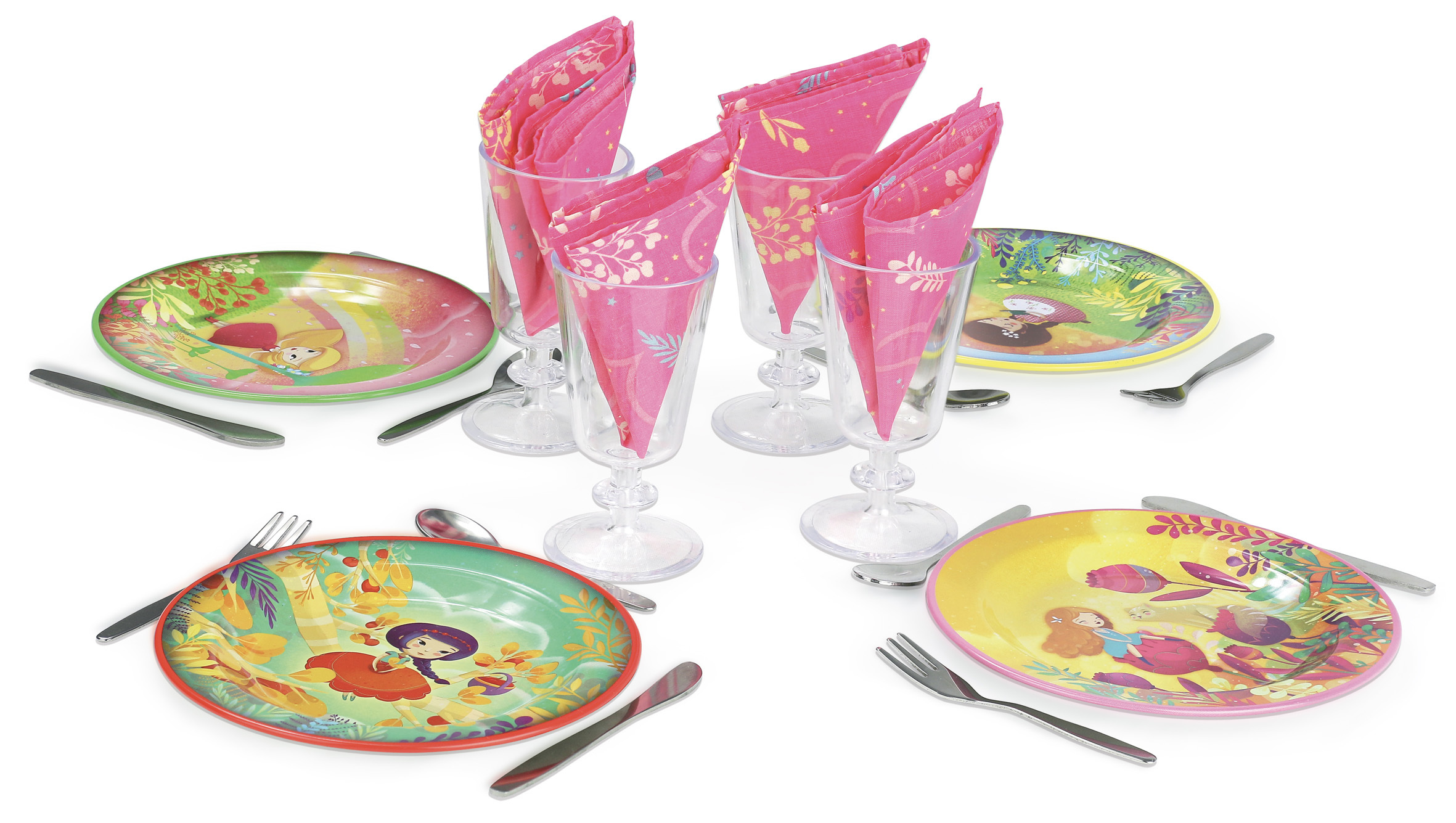 Krásná sada pro prostírání stolu obsahuje 4 talíře s příbory a originální poháry s dekoračními ubrousky. Stačí jen pozvat své přátele na něco dobrého. Balení obsahuje 24 ks příslušenství. Ilustrováno Annou-Marií Hugot. Hračky Vilac mají značku francouzské agentury ADEME, to znamená, že tyto dřevěné hračky jsou vyráběny ekologicky. Šetří životní prostředí, neznečišťují půdu, vodu a vzduch, neplýtvají energiemi. Již více než 100 let plní značka Vilac dětské sny. Společnost Vilac sídlí hluboko v srdci pohoří Jura, obklopena horami, jezery a lesy. Tato francouzská společnost vyrábí od roku 1911 dřevěné hračky v klasickém, starodávném stylu s moderními barvami a vzory. Hračky Vilac jsou jedinečné, nikdy nevyjdou z módy a dokáží okouzlit všechny generace. Vilac pomáhá utvářet dětskou představivost svými radostnými ilustracemi či dizajny a reinterpretací klasických hraček, které se jen tak neopotřebují. Děti dostávají na Vánoce a narozeniny spousty hraček, většina z nich je však nezaujme na dlouhou dobu, láska k hračce se nenaplní. Dřevěné hračky Vilac vzbuzují vášeň i o 50 let později, když jako dospělí náhodou najdete v podkroví hračky, které jste jako děti milovali. Vilac již 100 let propojuje děti s hračkami, které si oblíbí a váží si jich. A proč je děti tak milují? To zůstává tajemstvím firmy Vilac.