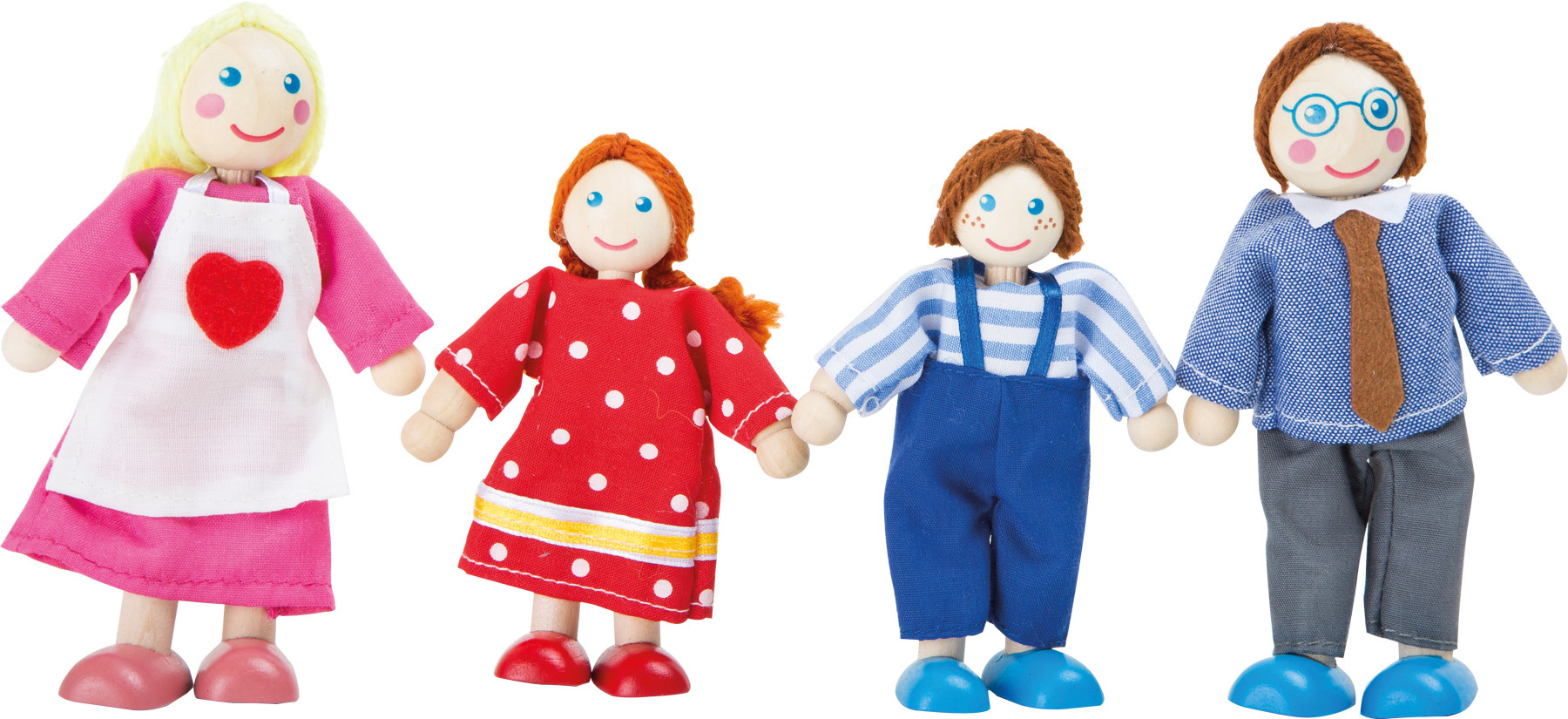 Dřevěné ohybatelné panenky rodina 4 ks v balení. Německá firma Legler zaměřená na výrobu kvalitních dřevěných hraček od roku 1996. Všechny dřevěné hračky značky small foot mají označení CE a jsou vyráběny dle evropské normy pro bezpečnost hraček EN 71. Použité barvy jsou speciálně vyvinuty pro dřevěné hračky a jsou odolné i proti slinám dětí. Dřevo, které se používá pro tyto hračky, většinou pochází z lesnických společností zapojených do zalesňování. To nabízí všem zákazníkům možnost přispět k zachování přirozeně rostoucích lesů. Dřevěné hračky small foot jsou zářivě barevné produkty, které jsou vyrobeny převážně z přírodních surovin - dřeva. Dětem dělají radost od útlého věku, rozvíjí jejich hmatové a smyslové dovednosti. Cílem značky small foot je podporovat duševní a fyzický vývoj dětí.