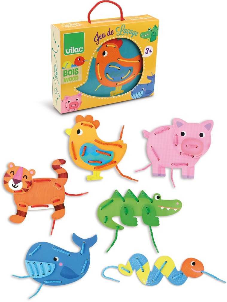 Tato provlékací hra obsahuje 17 dřevěných dílků, které představují 6 zvířat: prase, velrybu, slepici, tygra, krokodýla a žížalu. Podporuje rozvoj jemné motoriky. Hračky Vilac mají značku francouzské agentury ADEME, to znamená, že tyto dřevěné hračky jsou vyráběny ekologicky. Šetří životní prostředí, neznečišťují půdu, vodu a vzduch, neplýtvají energiemi. Již více než 100 let plní značka Vilac dětské sny. Společnost Vilac sídlí hluboko v srdci pohoří Jura, obklopena horami, jezery a lesy. Tato francouzská společnost vyrábí od roku 1911 dřevěné hračky v klasickém, starodávném stylu s moderními barvami a vzory. Hračky Vilac jsou jedinečné, nikdy nevyjdou z módy a dokáží okouzlit všechny generace. Vilac pomáhá utvářet dětskou představivost svými radostnými ilustracemi či dizajny a reinterpretací klasických hraček, které se jen tak neopotřebují. Děti dostávají na Vánoce a narozeniny spousty hraček, většina z nich je však nezaujme na dlouhou dobu, láska k hračce se nenaplní. Dřevěné hračky Vilac vzbuzují vášeň i o 50 let později, když jako dospělí náhodou najdete v podkroví hračky, které jste jako děti milovali. Vilac již 100 let propojuje děti s hračkami, které si oblíbí a váží si jich. A proč je děti tak milují? To zůstává tajemstvím firmy Vilac.