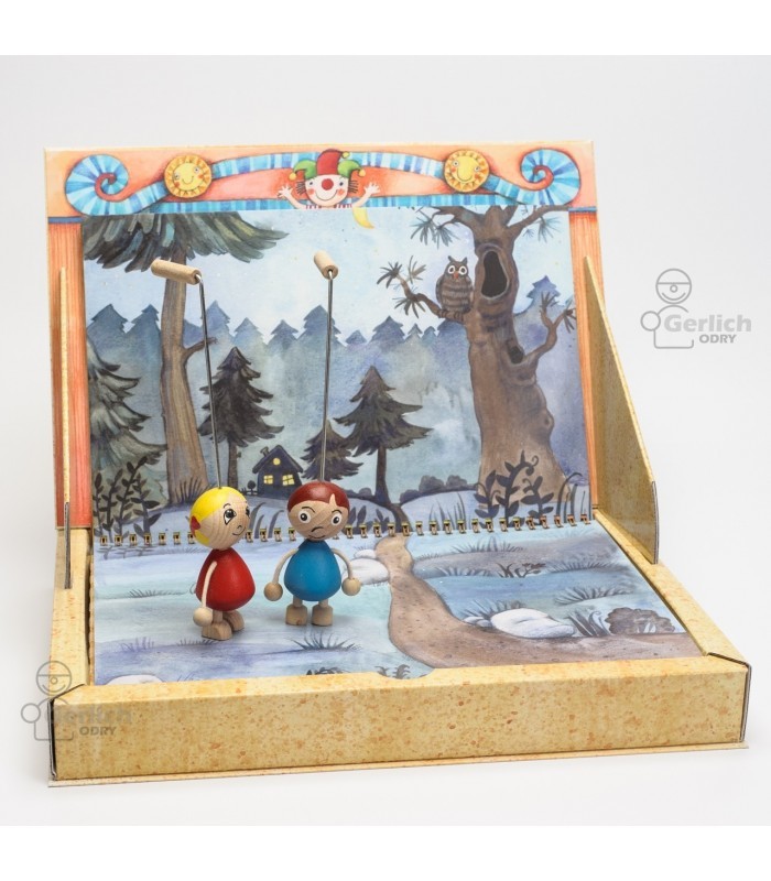 Knižní divadlo obsahuje 4 dřevěné loutky a 4 scény k pohádce O perníkové chaloupce. Součástí je pohádka O perníkové chaloupce. Loutky jsou jednoduché a dostatečně odolné i pro nejmenší loutkoherce. Vstupte do světa loukových divadel s naším knižním divadlem. Toto půvabné divadélko získalo ocenění Správná hračka! Nahlédněte s námi do světa fantazie a kouzel, kde si příběhy můžete tvořit i sami. Zahrajte si s dětmi pohádku v knižním loutkovém divadle, podpořte rozvoj jejich výrazových schopností, a při tomto dobrodružství nenásilně rozšiřte slovní zásobu a procvičte jemnou motoriku vašeho dítěte. Knižní divadlo obsahuje 4 dřevěné loutky a 4 scény k pohádce O perníkové chaloupce. Součástí je pohádka O perníkové chaloupce. Výška loutek 18-20 cm včetně vodícího drátu. Rozměr divadla 340 x 260 mm