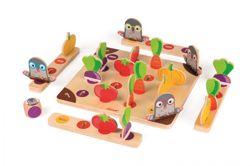 Společenská hra pro děti Krtci Janod na rychlost a pozornost je určena pro děti ve věku 3 - 6 let, pro 2-4 hráčů. Cílem hry je naplnit svůj košík čtyřmi druhy zeleniny dříve než ostatní spoluhráči. Buď první ale pozor musíš se snažit vyhnout krtkem v zahradě! Společenská hra pro děti na rychlost a pozornost. Hru je možné využít v dřívějším věku na učení barev (třídění do množin podle barvy). Společenská hra Krtci Janod na zdokonalení soustředěnosti pro děti od 3 let. Hra rozvíjí: Rychlost Pozornost a soustředění Strategické myšlení
