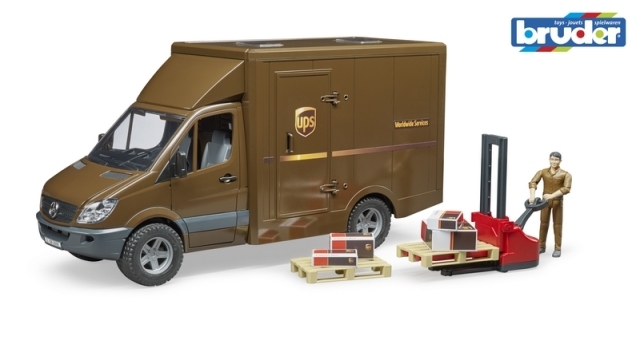 Bruder MB SPRINTER UPS s řidičem a příslušenstvím Logistický set Bruder 02538 s dodávkou Mercedes Benz Sprinter a příslušenstvím se bude líbit každému malému přepravci. Dodávka Mercedes Benz Sprinter má spoustu funkčních prvků, např. otevírací dveře, otevírací boční a zadní dveře nákladového prostoru, atd. Součástí balení je také figurka řidiče, která má pohyblivé končetiny a může do nich uchopit příslušenství Bruder BWORLD. Paletový vozík, který je součástí balení je funkční a můžete jím nakládat či vykládat palety s balíky.