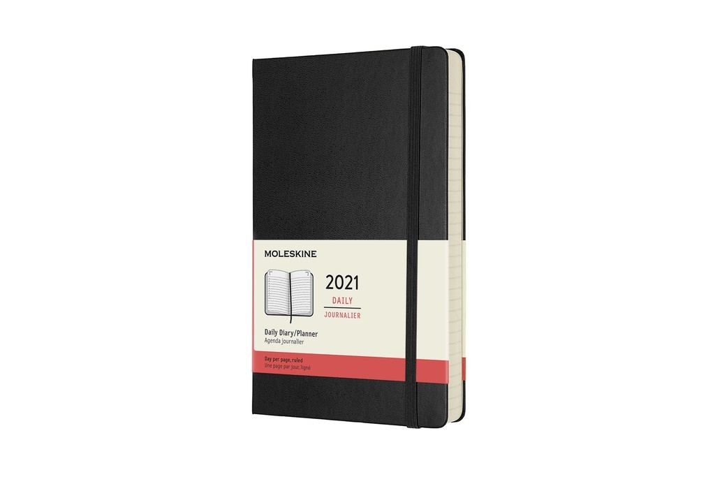 Klasický velký černý denní diář na rok 2021. Na každý den stránka pro poznámky a schůzky. Diář má pevnou, ve hřbetu šitou vazbu v kartonových deskách. Obepíná ho pružná páska proti samovolnému otevírání. Obsahuje praktickou vnitřní kapsu na vizitky a dokumenty, textilní záložku a 295 barevných samolepek. Papír s gramáží 70 g/m2 neobsahuje kyseliny.
