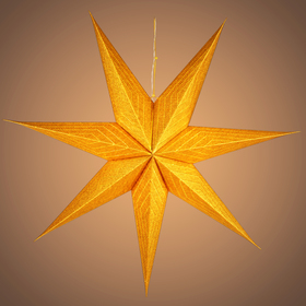 Hvězda vánoční sedmicípáMateriál: Směs papíru a bavlnyStrukturovaný povrchBarva zlatá10LEDBarva světla: teplá bíláNapájení: 3xAAČasovač: 6/18 hPrůměr hvězdy: 75cm