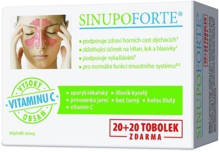 SINUPO Forte® je doplněk stravy obsahující extrakty rostlin, zvláště pak prvosenku jarní, která přispívá k normální funkci dýchacího systému. Vitamin C v SINUPO Forte® přispívá ke snížení míry únavy a vyčerpání, k ochraně buněk před oxidativním stresem a společně s bezem černým i k normální...
