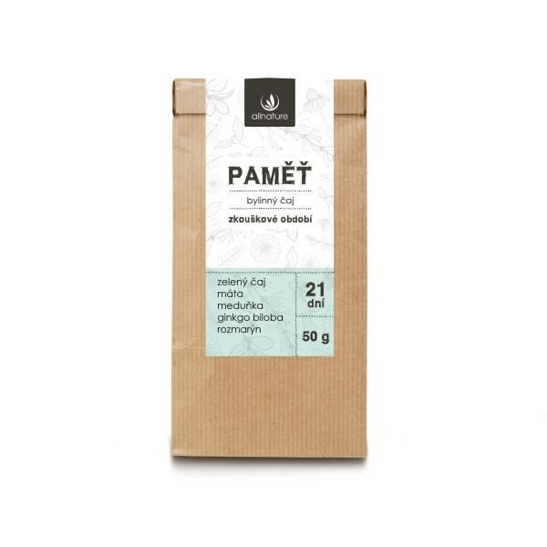 Paměť Bylinný čaj obsahuje lístky kvalitního zeleného čaje, a nejznámější a nejzdravější povzbuzovače, mátu, meduňku, ginkgo bilobu a rozmarýn.