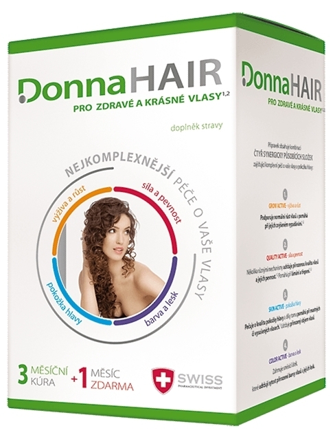 DonnaHAIR 4 měsíční kúra je limitovaná edice s extra účinným složením s rychlejším nástupem účinku, dlouhodobějším působením a viditelně lepší kvalitou vlasů. Navíc s extraktem přesličky rolní a kopřivy dvoudomé. Jediná tobolka DonnaHAIR® FORTE obsahuje zvýšenou dávku aminokyselin, které jsou pro strukturu vlasů klíčové. Tento doplněk stravy je vhodný i pro těhotné a kojící ženy.