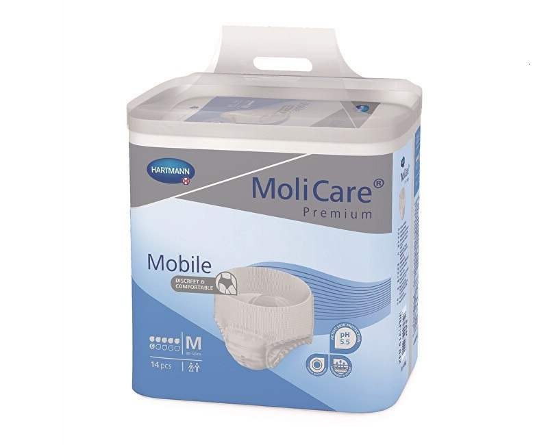 Natahovací kalhotky MoliCare Mobile 6 kapek vám zajistí bezpečnou ochranu a zároveň pocit pohodlí jako ve vlastním spodním prádle. MoliCare Mobile jsou určeny pro ženy i muže s těžkou inkontinencí. Díky tvaru spodního prádla jsou nenápadné pod oblečením. Prodyšné materiály udržují zdravou pokožku. Spolehlivě absorbují moč i zápach, můžete se na ně spolehnout v každé situaci.