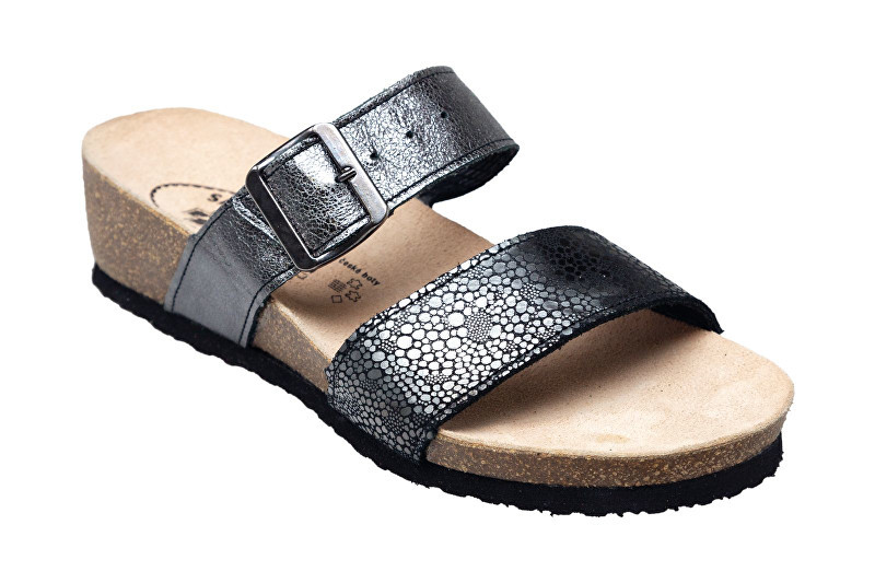 Zdravotní obuv - dámské pantofle,barva: černá s metalickým odleskem, vzor,podešev: černá,stélka: anatomicky tvarovaná, kožená,materiál: kůže,zapínání na přezku. číst celé