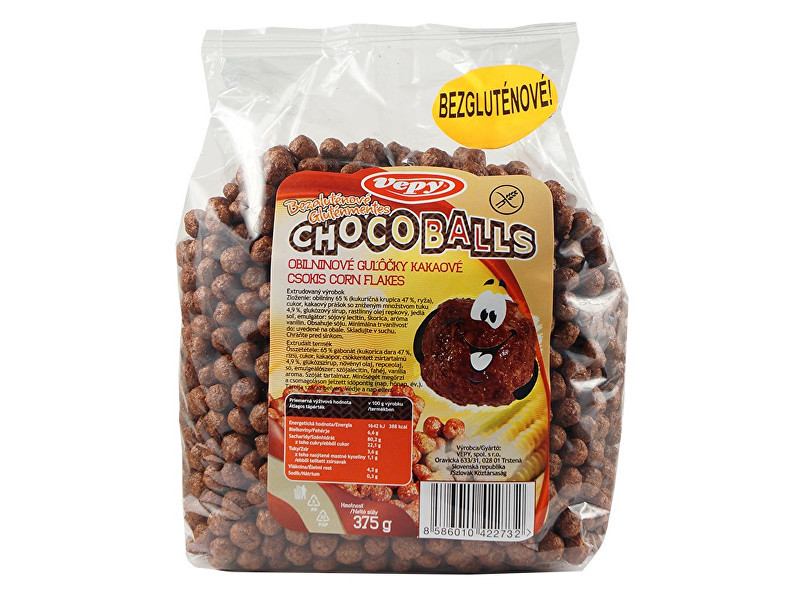 Obilninové kuličky kakaové bezlepkové. Společnost VEPY rozšířila sortiment o další chutný výrobek vyrobený za použití obilnin , které jsou přirozeně bezlepkové a bez přidaní soli. Kakaové kuličky pro malé i velké mlsouny. Složení: obilniny 65% (kukuřičná krupice 47%, rýže), cukr, kakaový prášek odtučněný 4,9%, glukózový sirup, rostlinný olej řepkový, jedlá sůl, emulgátor: slunečnicový lecitin, skořice, aroma vanilinObsah: 375 g