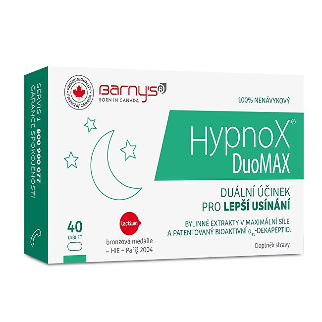 Přípravek Hypnox DuoMAX představuje unikátní směs bylin, vitamínu B6 a bioaktivního alfa dekapeptidu pro lepší komfort usínání.