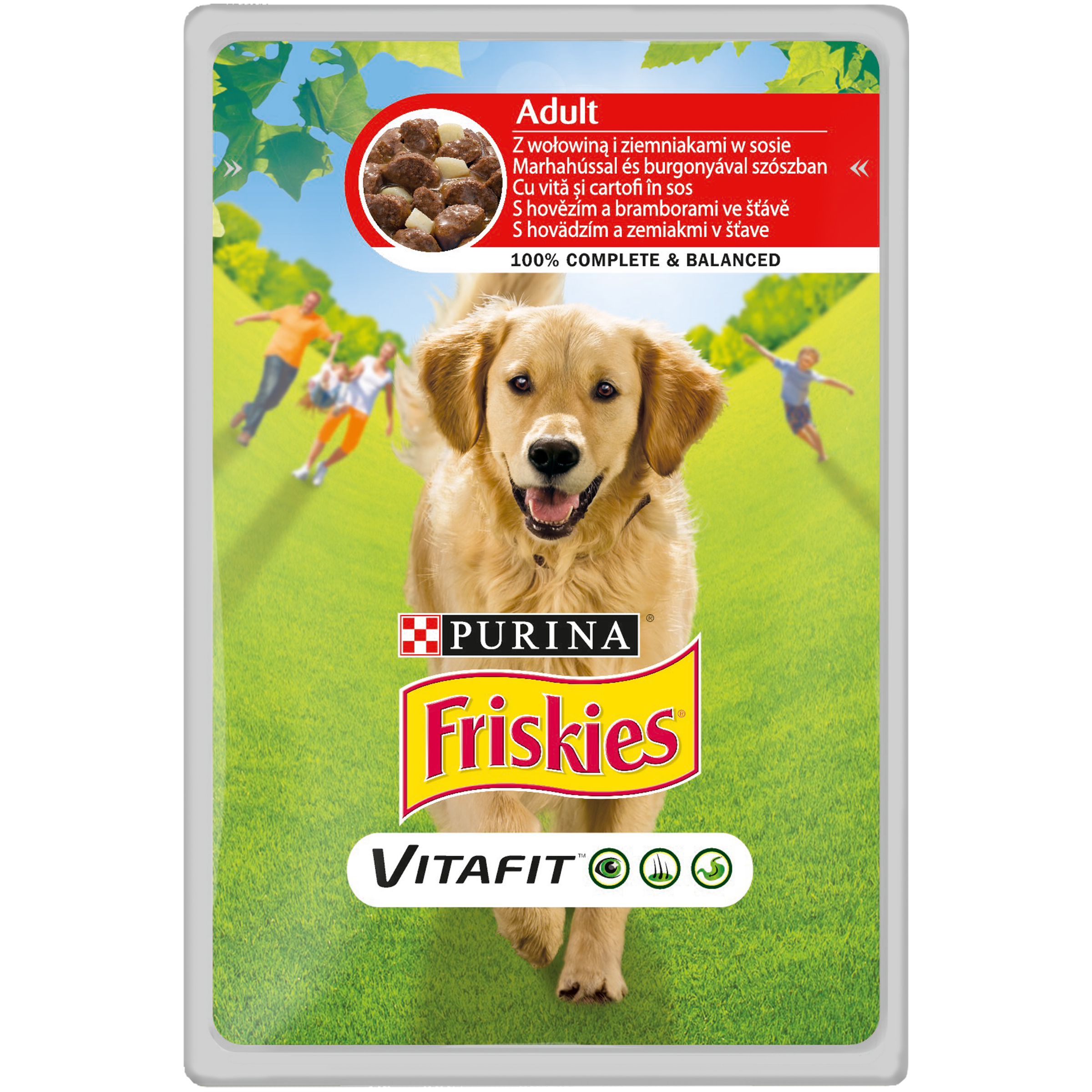 PURINA Friskies Vitafit s hovězím a bramborami ve šťávě je chutná kompletní receptura, která poskytuje vašemu psovi vitamíny a další živiny, které potřebuje ke zdraví. Kompletní krmivo pro dospělé psy, které podporuje zdraví vašeho psa a můžete na něm pozorovat následující znaky vitality: