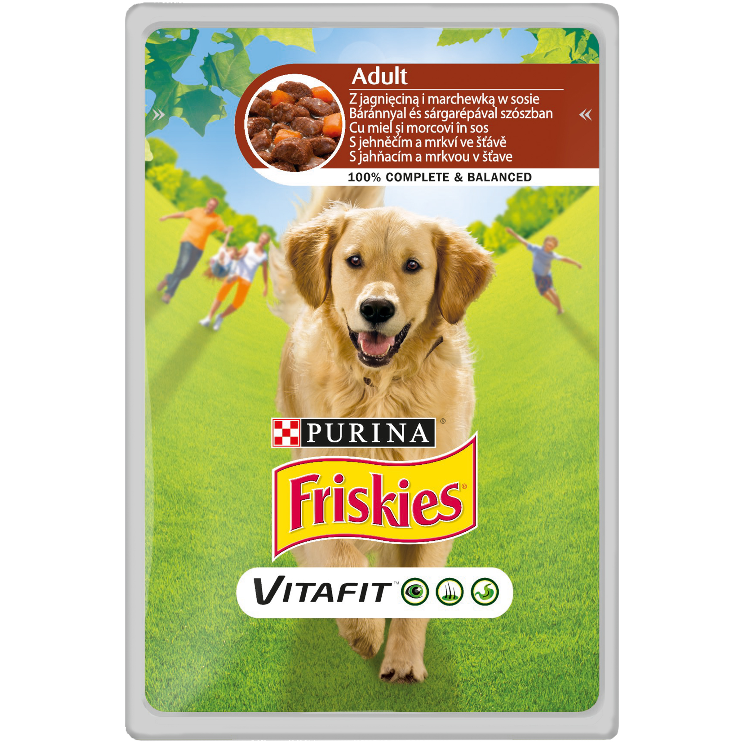 PURINA Friskies Vitafi s jehněčím a mrkvní ve štávě je chutná kompletní receptura, která poskytuje vašemu psovi vitamíny a další živiny, které potřebuje ke zdraví. Kompletní krmivo pro dospělé, které podporuje zdraví vašeho psa a můžete na něm pozorovat