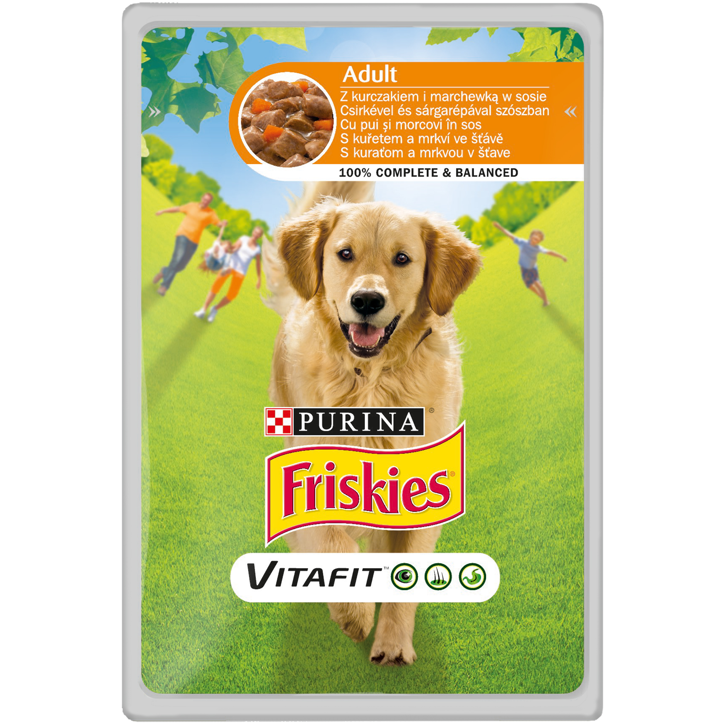 PURINA Friskies Vitafit kuře a mrkev ve šťávě je kompletní receptura, která poskytuje vašemu psovi vitamíny a další živiny, které potřebuje ke zdraví. Kompletní krmivo pro dospělé psy, které podporuje zdraví vašeho psa a můžete na něm pozorovat následující znaky vitality:
