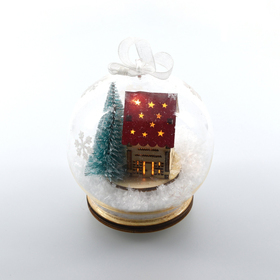 Skleněná ozdoba s dekorem "dům" a umělým sněhem1 LEDBarva světla: teplá bíláMateriál sklo + dřevěná překližkaNapájení 3xLR44 (obsaženo v dodávce)Časovač: 6/18 h číst celé