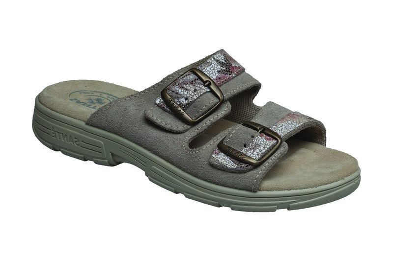 Zdravotní obuv - dámská zdravotní pantofel,barva: béžová se vzorem,podešev: - světlá,svrchní materiál: kůže,stélka: kožená, anatomicky tvarovaná se srdíčkem,nastavitelné zapínání - přezky.