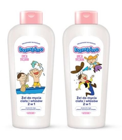 Koupelová kosmetika pro kojence a děti od Bambino je velmi jemná. Gel 2v1 pro mytí těla a vlasků díky pečujícímu složení chrání pokožku před vysycháním a zanechává čisté a měkké vlasy.