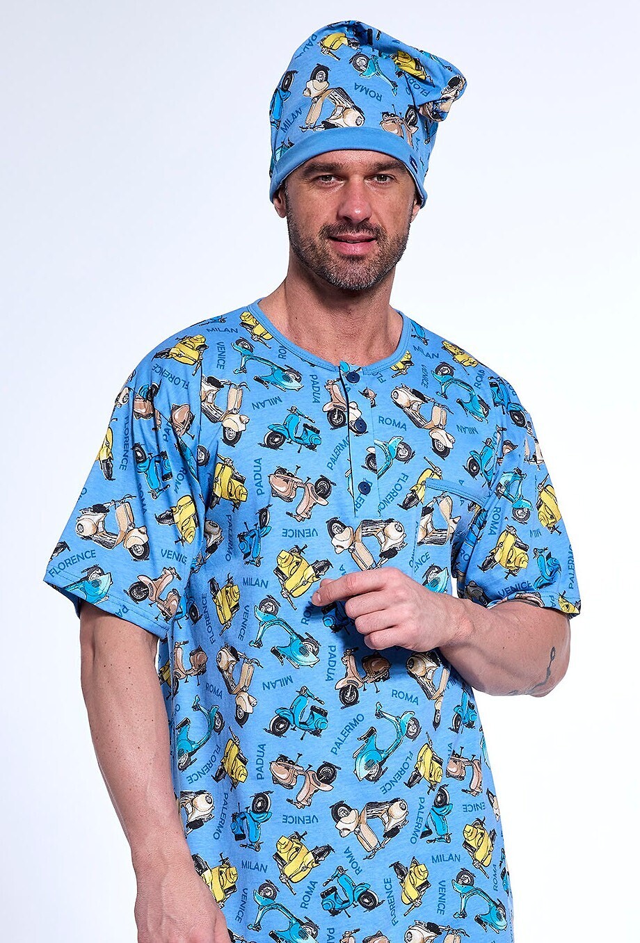 Koszula nocna, męska- wzorzysta bawełna - krótki rękaw- dekolt zapinany na guziki- na wysokości klatki piersiowej mała kieszonka- do kompletu szlafmycaSkład: 100% bawełna číst celé