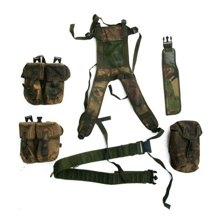 Nosný systém z výprodeje britské armády v maskování DPM. Obsahuje opasek PLCE, pouzdro na mačetu, dvě dvojsumky PLCE, sumka na polní láhev PLCE a treky.