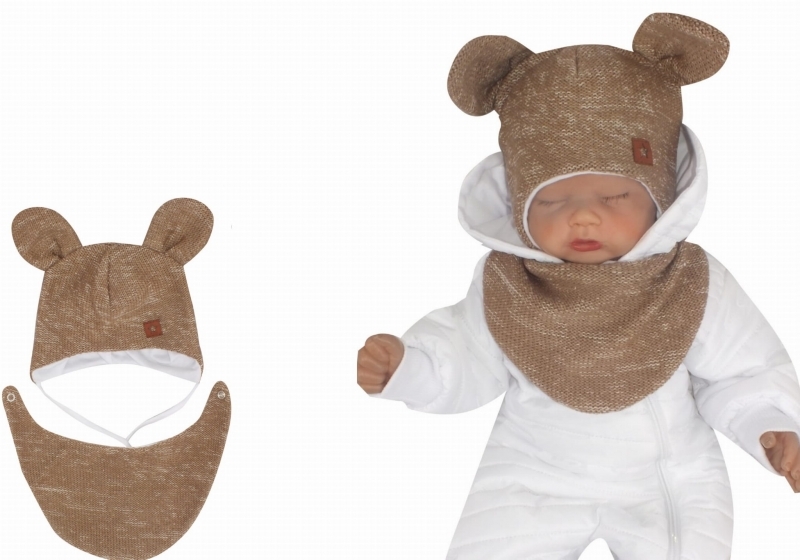 Z&Z Dvouvrstvá pletená čepice na zavazování s šátkem 2v1, Méďa - hnědá, vel. 86; 86 (12-18m)