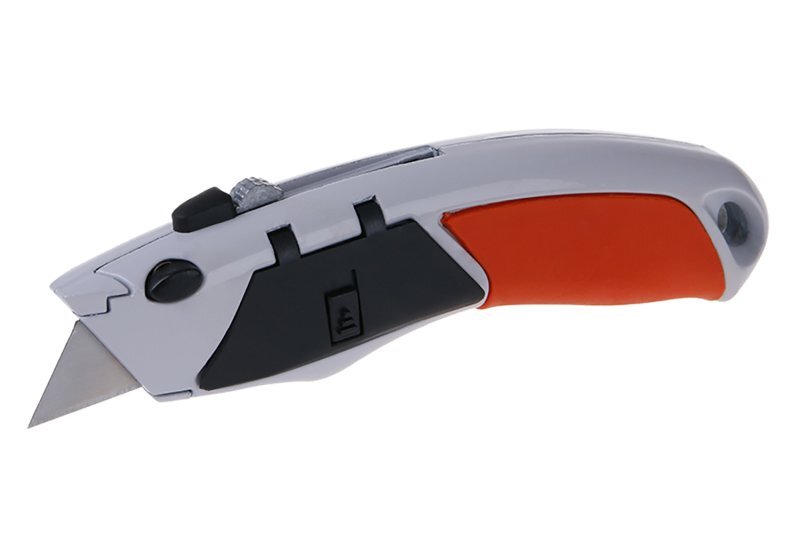Kovový nůž s výsuvnou lichoběžníkovou čepelí, čepel uchycena uvnitř těla nože na posuvném jezdci, ergonomický tvar, tlačítko pro snadnou a rychlou výměnu čepele, zásobník na náhradní čepele, automatická výměna čepele (při naplněném zásobníku), 5 náhradních čepelí.
