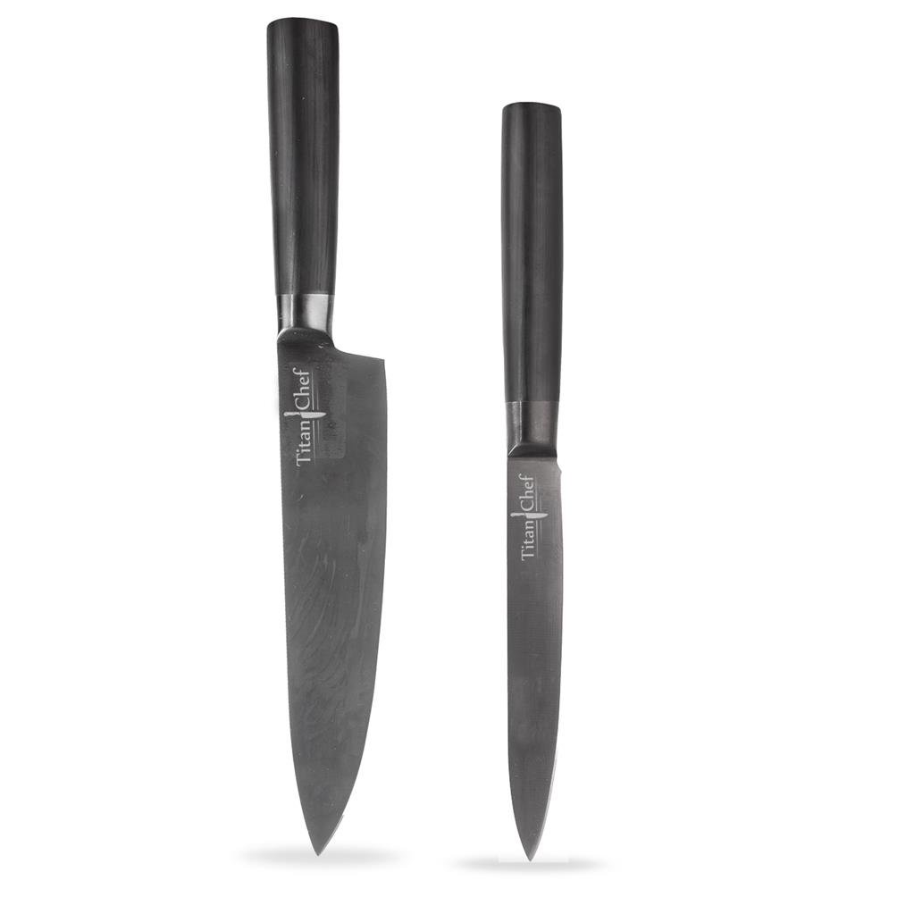 Kuchyňský nůž v luxusním provedení - černě zbarvená čepel s titanovým povrchem. Rukojeť skvěle padne do ruky. Krájení je snadné, přesné. Sada 2 ks. Materiál: nerezová ocel, titanová vrstva na čepeli, plast. Rozměry: celková délka nože 24,5 cm, d. čepele 12,5 cm, š. čepele 2 cm a celková délka nože 33,5 cm, d. čepele 20,5 cm, š. čepele 4,5 cm.