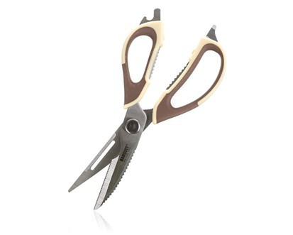 Tyto rozložitelné kuchyňské nůžky nejsou určeny jen ke střihu - snadno s nimi otevřete láhve, oloupete ovoce a zeleninu, rozlousknete ořechy, nakrájíte kartony, očistíte ryby i porcujete drůbež. Praktické béžovo-hnědé rukojeti nejen dobře vypadají, ale i pohodlně padnou do ruky.
