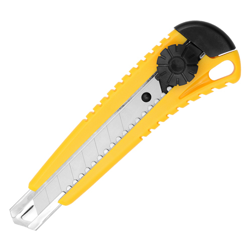 Velký ořezávací nůž s odlamovací čepelí, vysouvané pomocí polohovacího jezdce se zarážkami, šírky 18 mm z ušlechtilé oceli, délka čepele sa dá manuálně nastavit; tělo nože je vyrobené z kvalitního, na dotek příjemného PVC. Dodávaný s 2 náhradními čepelemi číst celé
