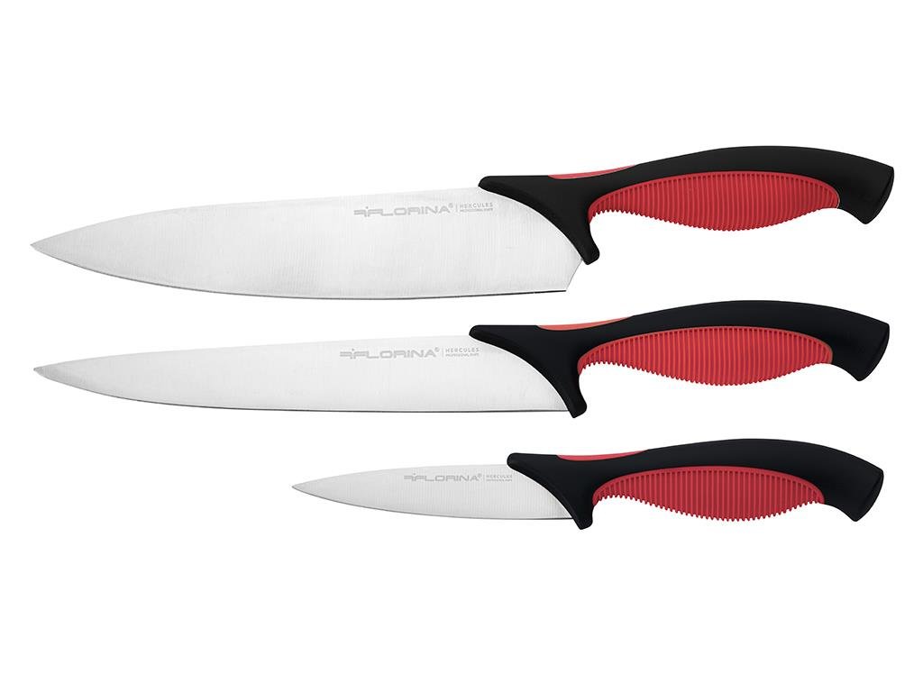 SADA 3 NOŽŮ: NŮŽ NA ZELENINU (DÉLKA ČEPELE: 10,5CM, CELKOVÁ DÉLKA: 21,5CM; TLOUŠŤKA LISTU: 1,5MM); NŮŽ NA MASO (DÉLKA ČEPELE: 20,6CM, CELKOVÁ DÉLKA: 32,4CM, TLOUŠŤKA ČEPELE: 2,0MM); KUCHÁŘSKÝ NŮŽ (DÉLKA ČEPELE: 20,6CM, CELKOVÁ DÉLKA: 32,8CM, TLOUŠŤKA ČEPELE: 2,0MM); MATERIÁL: ČEPEL - NEREZ 3Cr14; RUKOJEŤ: PP + TPR - PROTISKLUZUJÍCÍ)