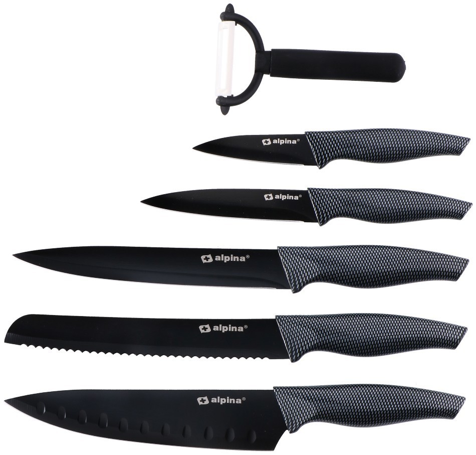Šestidílná sada nožů z ušlechtilé oceli se škrabkou Luxus značky Alpina. Sada se skládá z pěti nožů z ušlechtilé oceli, nožového santoku, nože na chleba, krájecího nože, univerzálního nože a loupacího nože. Každá lopata má nepřilnavou vrstvu, černou a jednu černou šachovnici. Kromě toho sada obsahuje černou škrabku na zeleninu s bílou rovinou řezu. Dárkové balení. Sada je zabalena v krásné dárkové krabičce a je tak ideálním dárkem pro kolaudační párty nebo svatbu.