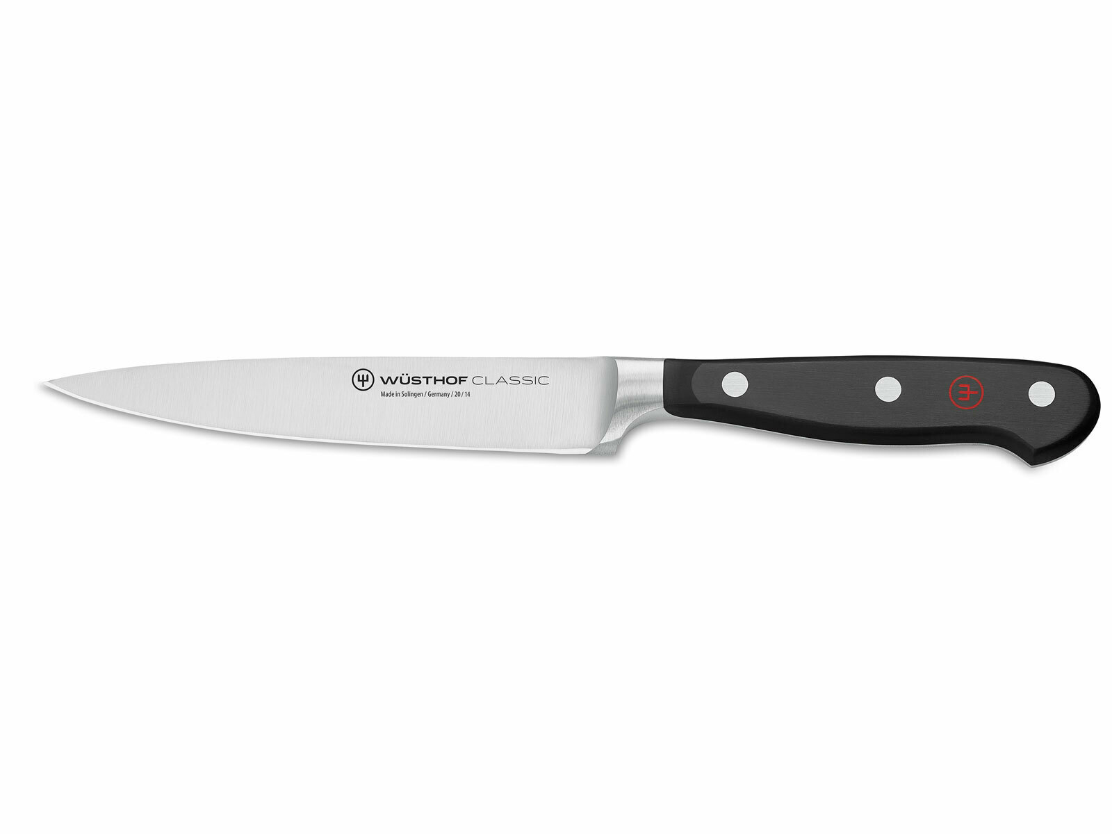 Univerzálny nôž Wüsthof Classic na krájanie šunky, ovocia a zeleniny. Má dlhú špicatú čepeľ s hladkým ostrím z nehrdzavejúcej ocele X50CrMoV15. Rukoväť je z čierneho syntetického materiálu. Na rukoväti sa nachádza logo firmy Wüsthof. číst celé