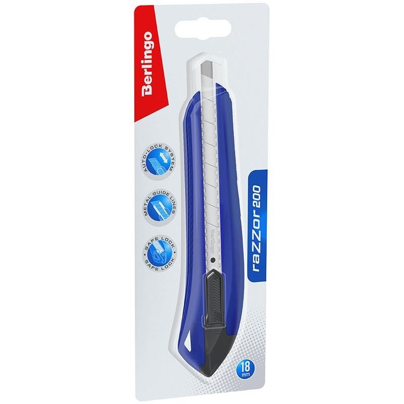 Nóż biurowy Seria Brzytwa 200 z automatyczną blokadą ostrza. Korpus noża wykonany jest z wysokiej jakości tworzywa ABS w kolorze niebieskim. Posiada metalowe prowadnice. Wyposażony w odporne na ścieranie ostrze wykonane ze stali SK5. SK-5 to stal narzędziowa wysokowęglowa bardzo wytrzymała, odporna na pęknięcia i wykruszenia oraz bardzo długo utrzymuje ostrość. Ukośne grawerowanie laserowe pozwala na odłamanie zużytej częsci noża dokładnie w miejscu zaznaczenia. Szerokość ostrza - 18 mm.Opakowanie jednostkowe - blister z zawieszką euro. Na odwrocie blistra znajduje się perforacja ułatwiająca wyjmowanie narzędzia z opakowania.