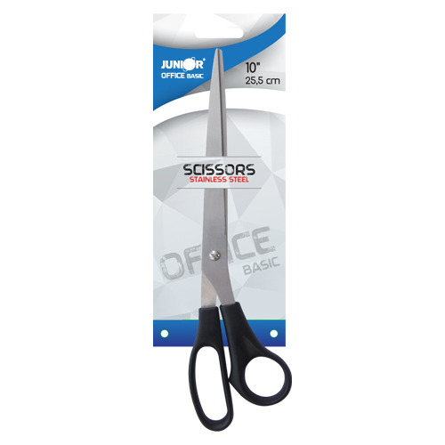 Nůžky s asymetrickými rukojeťmi z PVC, délka nůžek 255 mm, dodávané na blistru. Rozměr: 255x70mm, 125mm čepel.