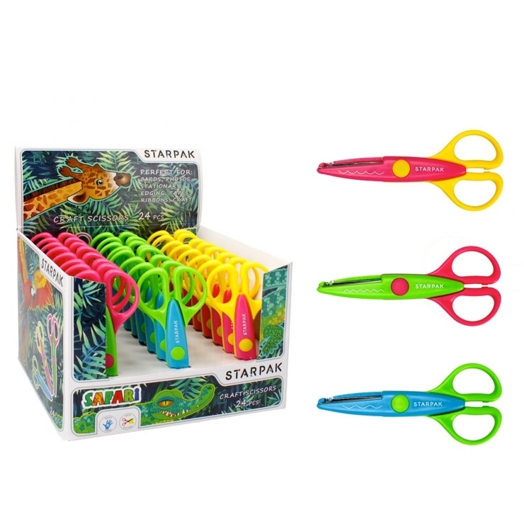 Vroubkované nůžky, 14 cm dlouhé, vyrobeny z odolného materiálu, v plastovém obalu se zaoblenými hroty pro bezpečnost dětí. Ideální pro vytváření ozdob a dekorací. Dostupné ve třech barvách: zelená, modrá, růžová.